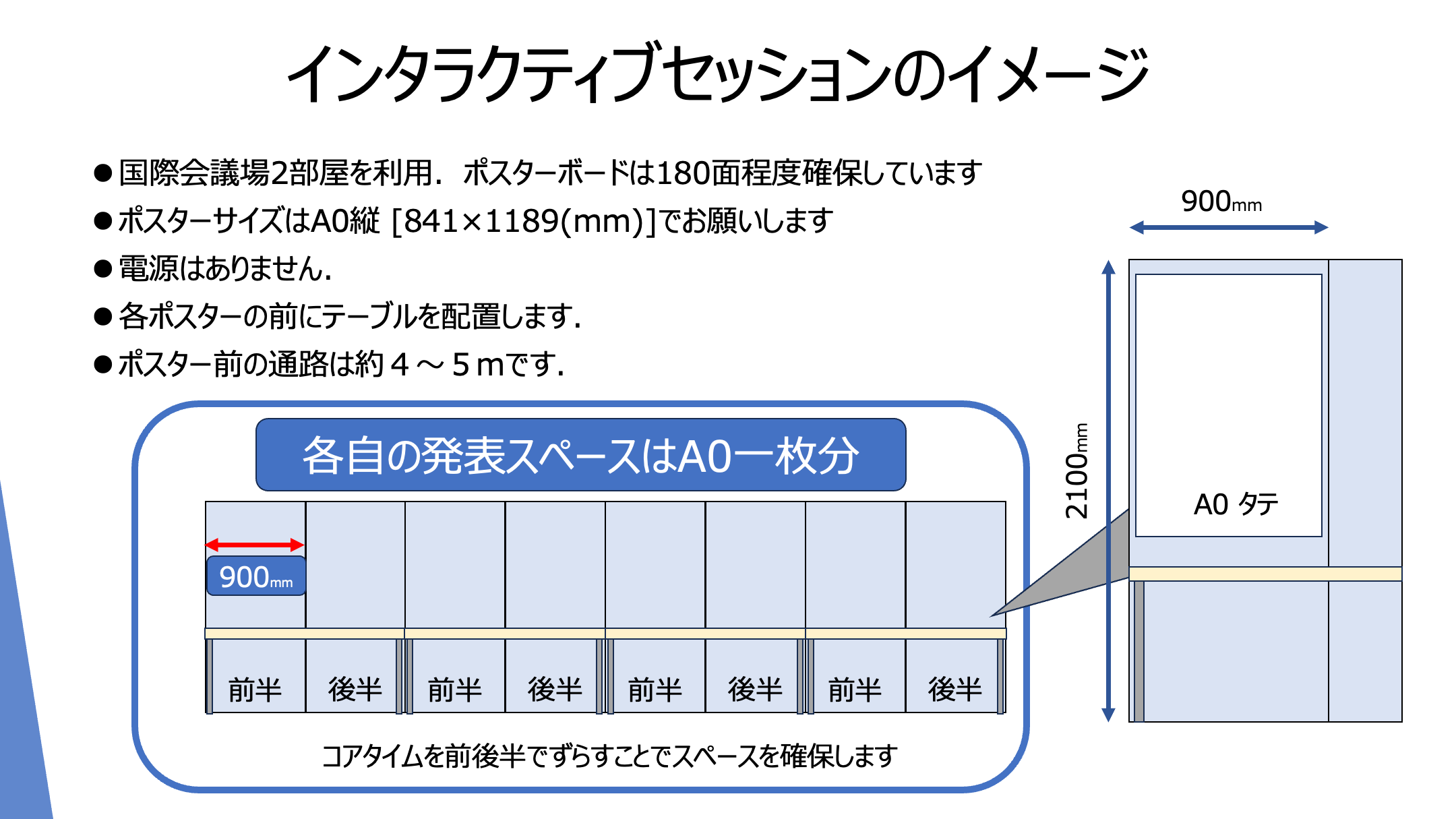 • 隣り合う発表者との交互のコアタイム制とし、 コアタイムは45分です。