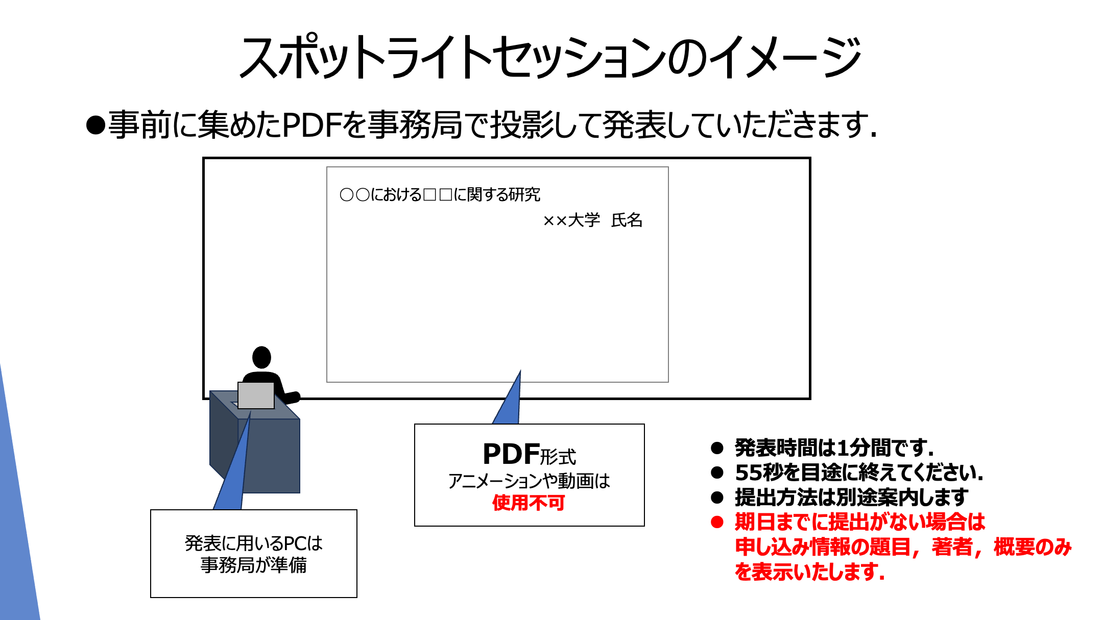 • 講演者の交代を考慮し、講演内容は55秒程度で構成してください。